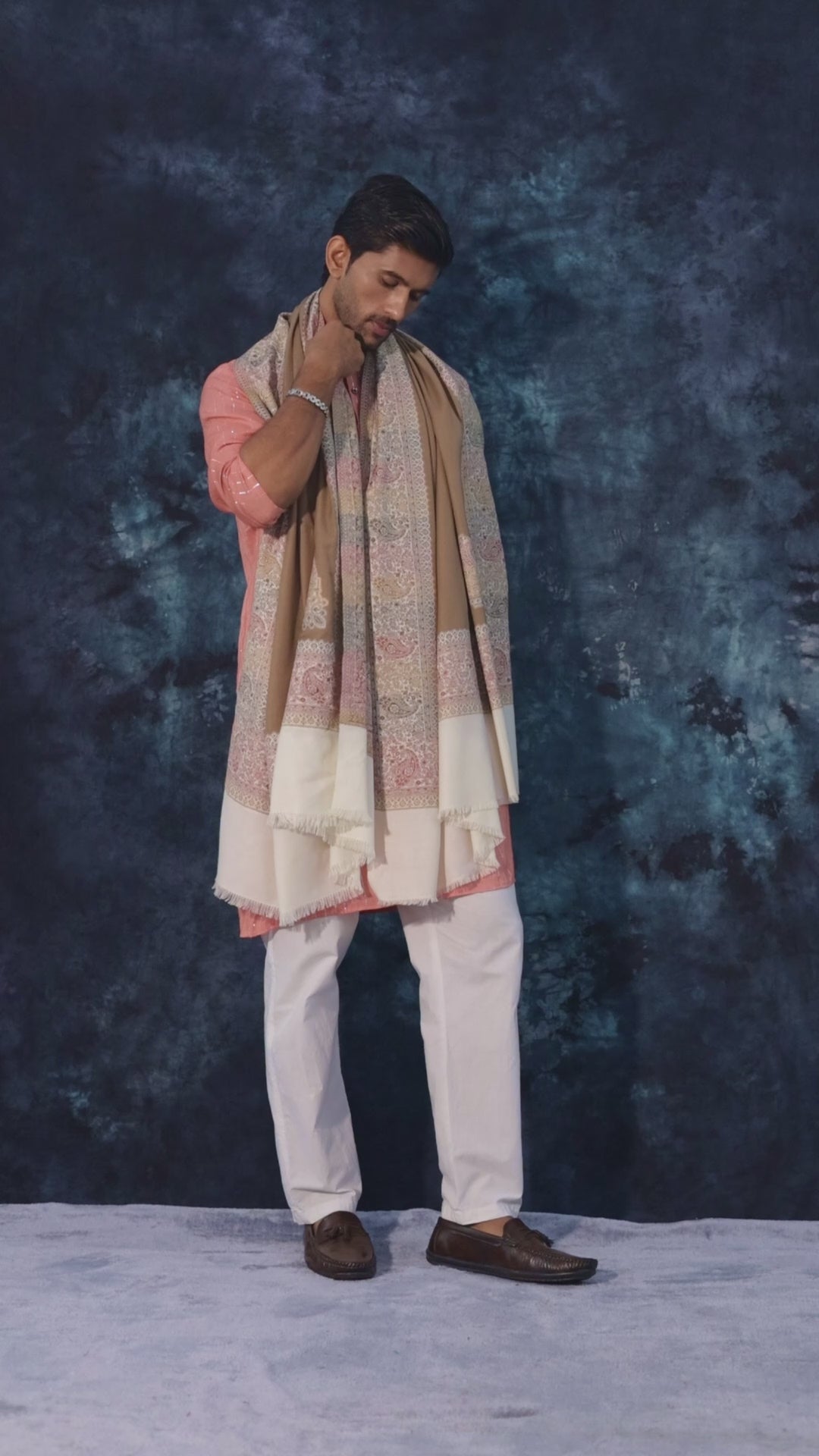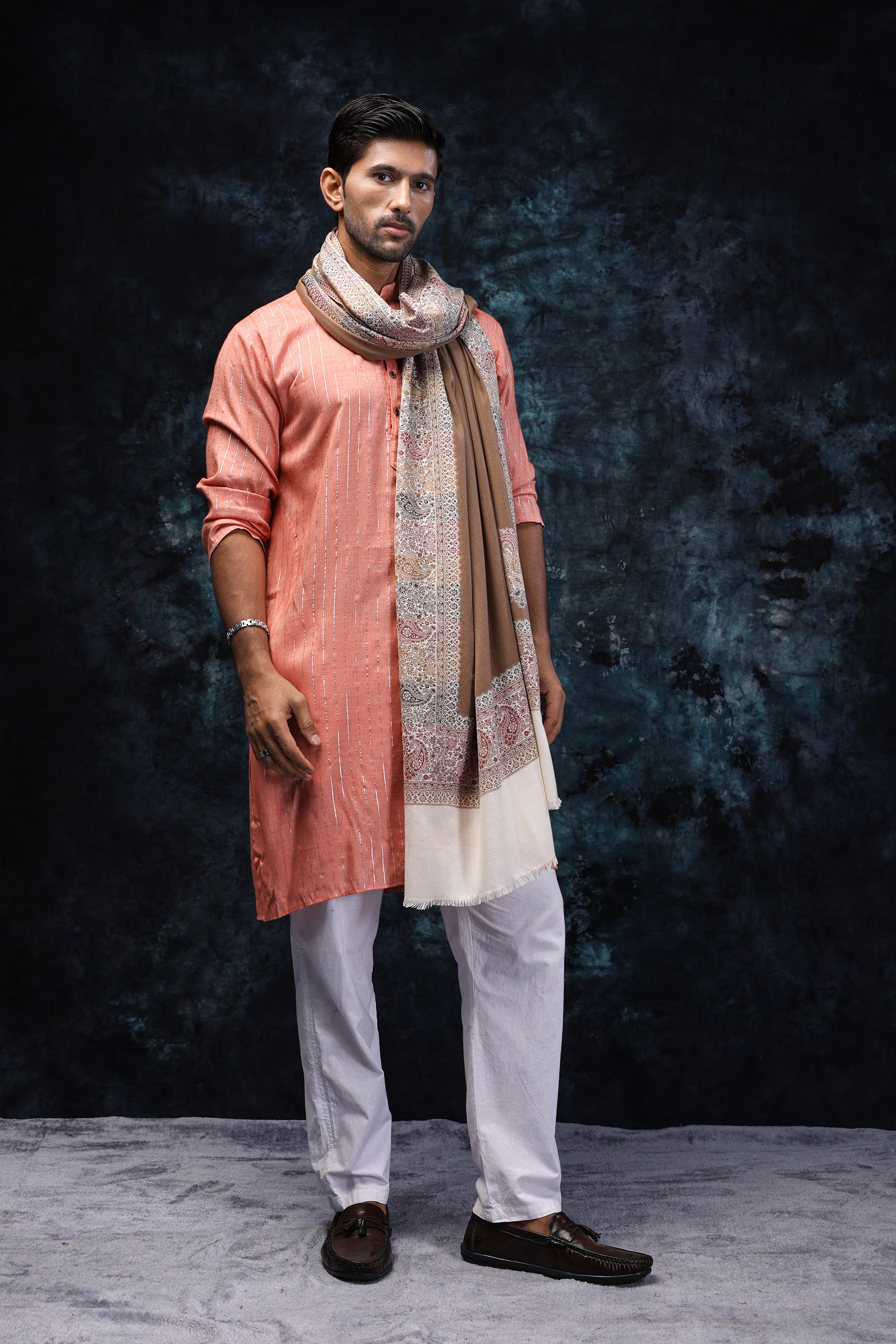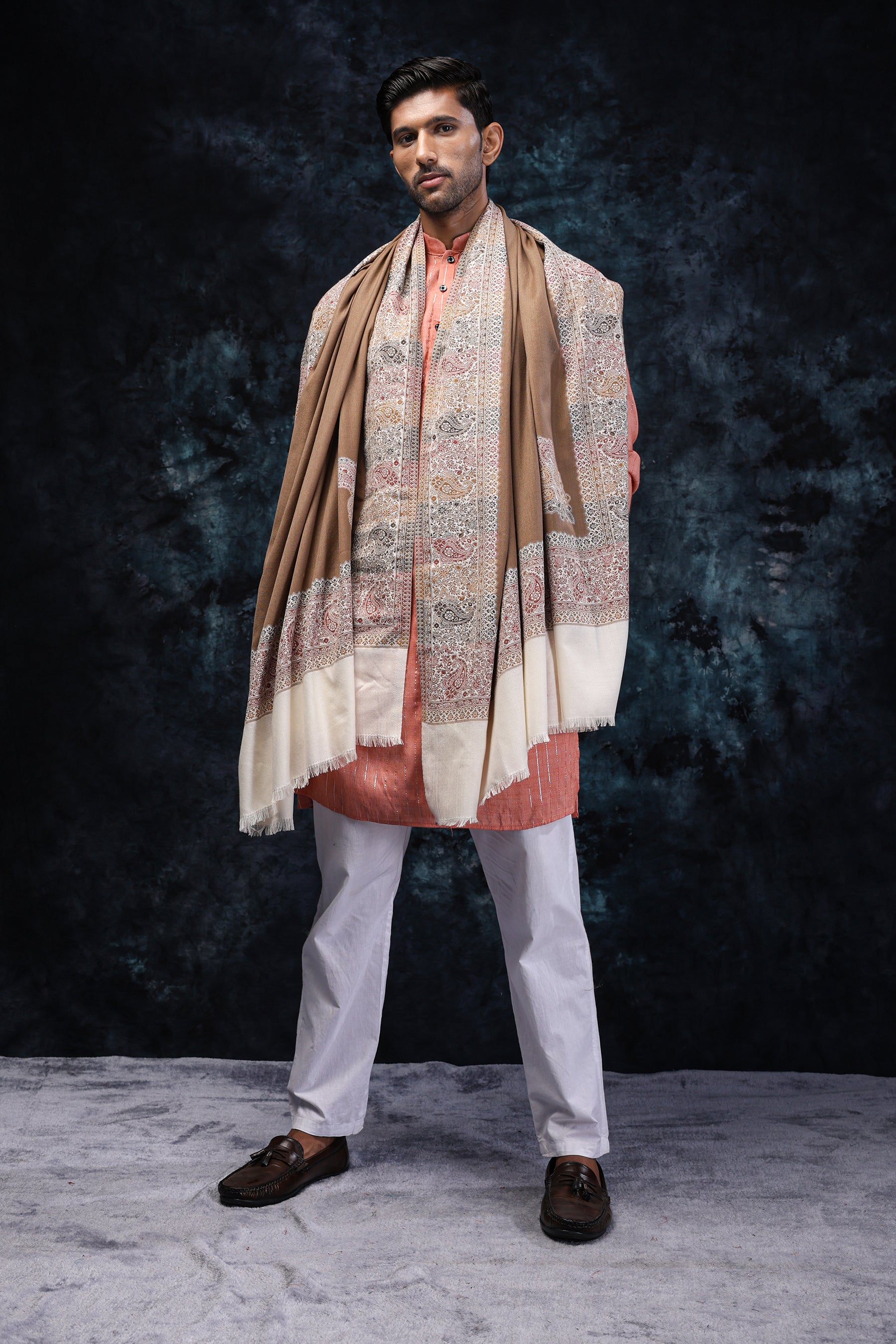 - Name: Cream and Brown Shawl with Multicolor Paisley Borders
