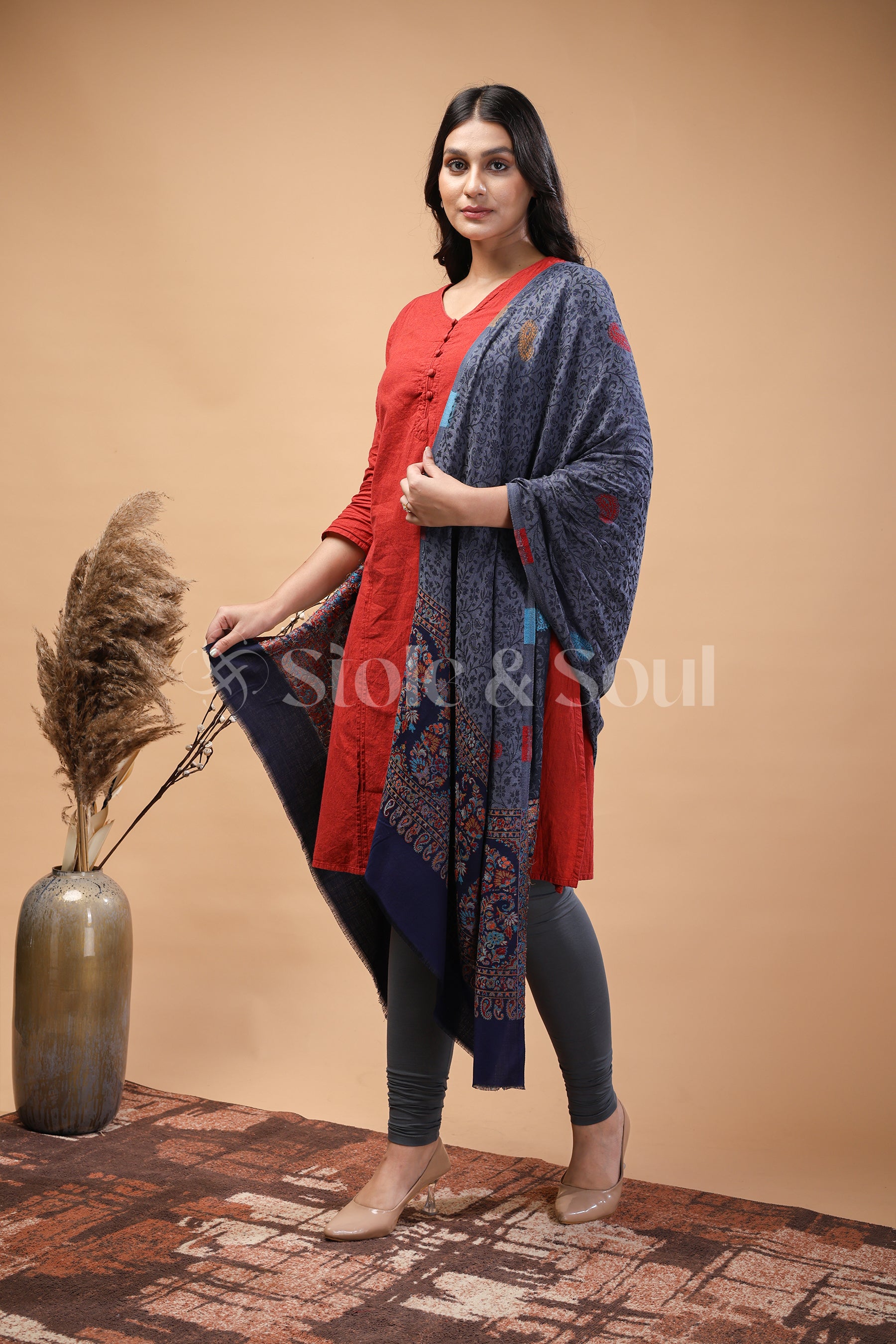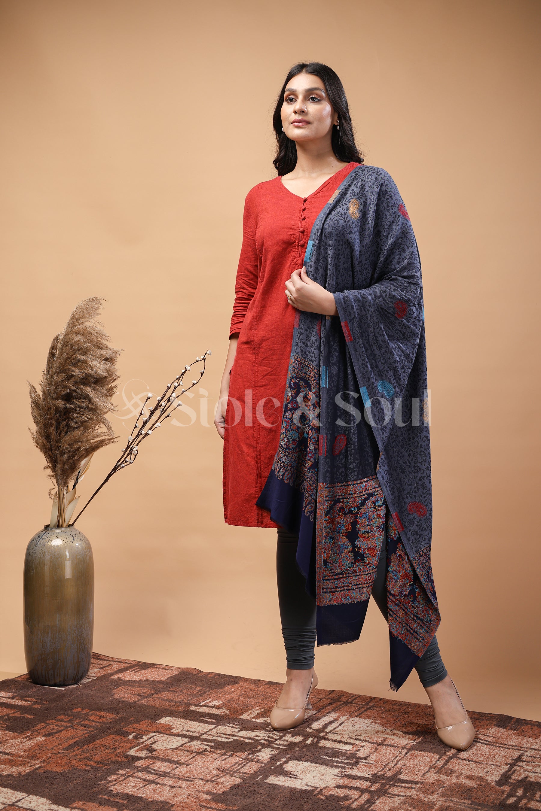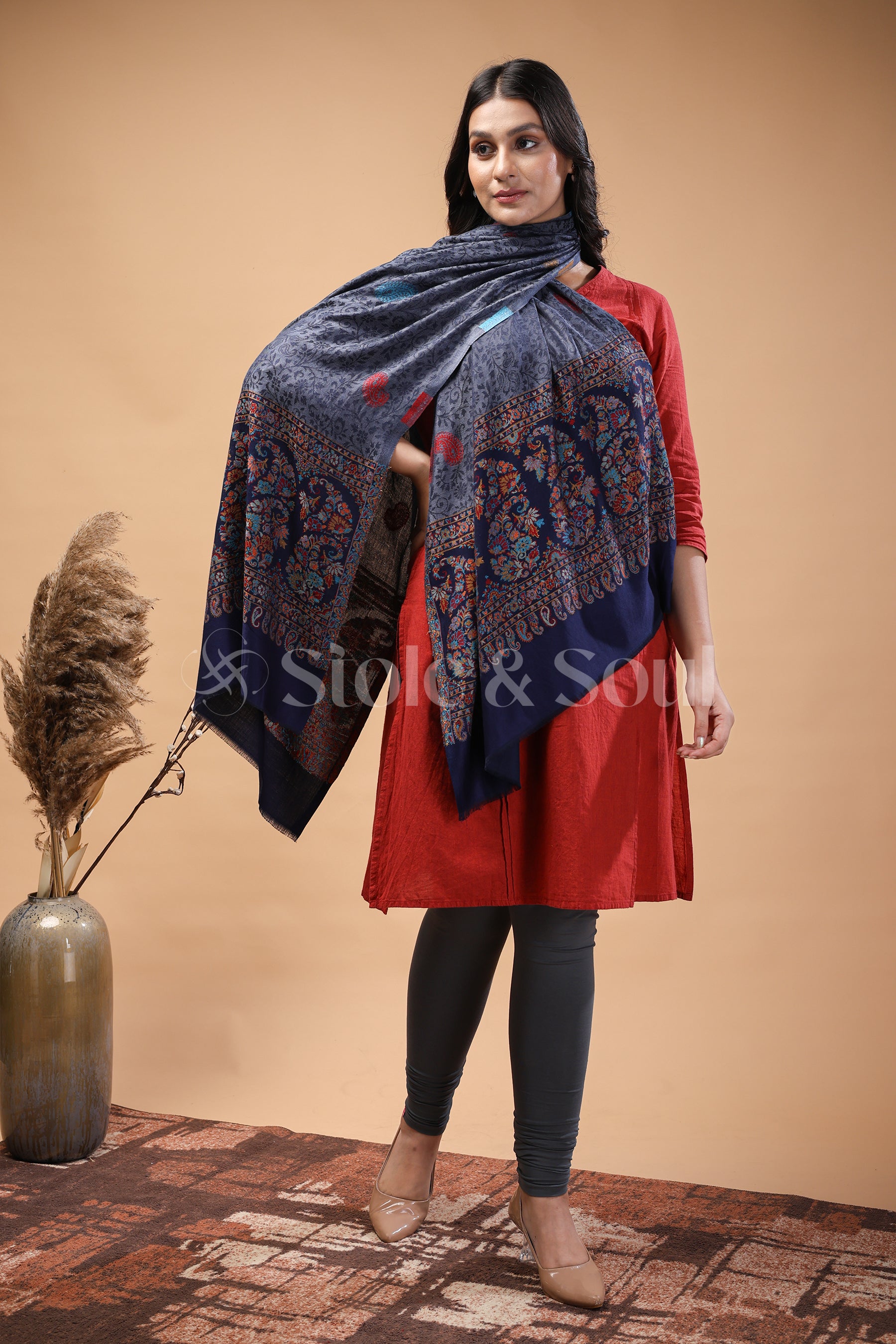 Greyish Blue with Black Border , Paisley and Garden Blooming , Bamboo Silk