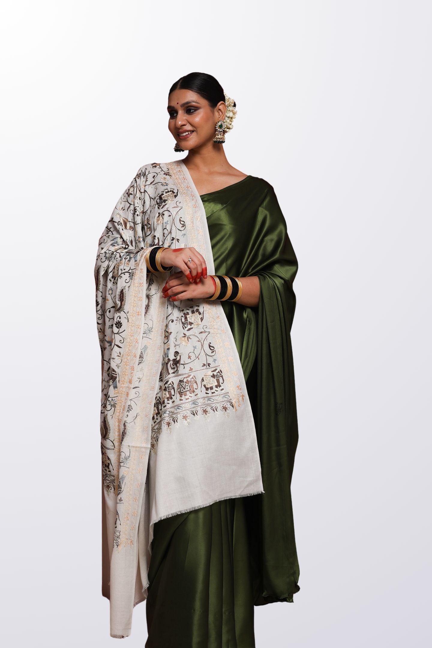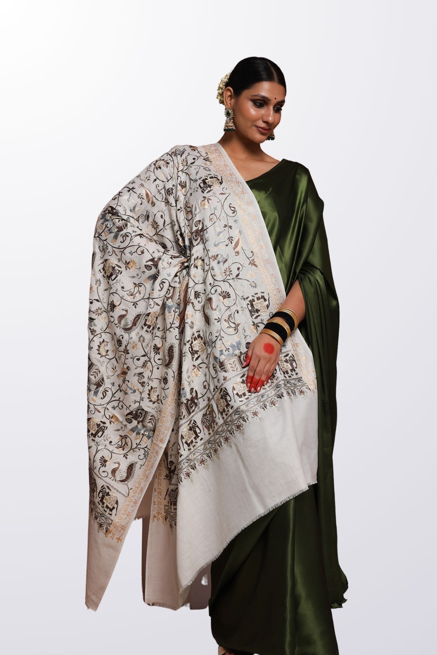 - Name: Nalki fine wool white shawl - Elephant and peacock motifs